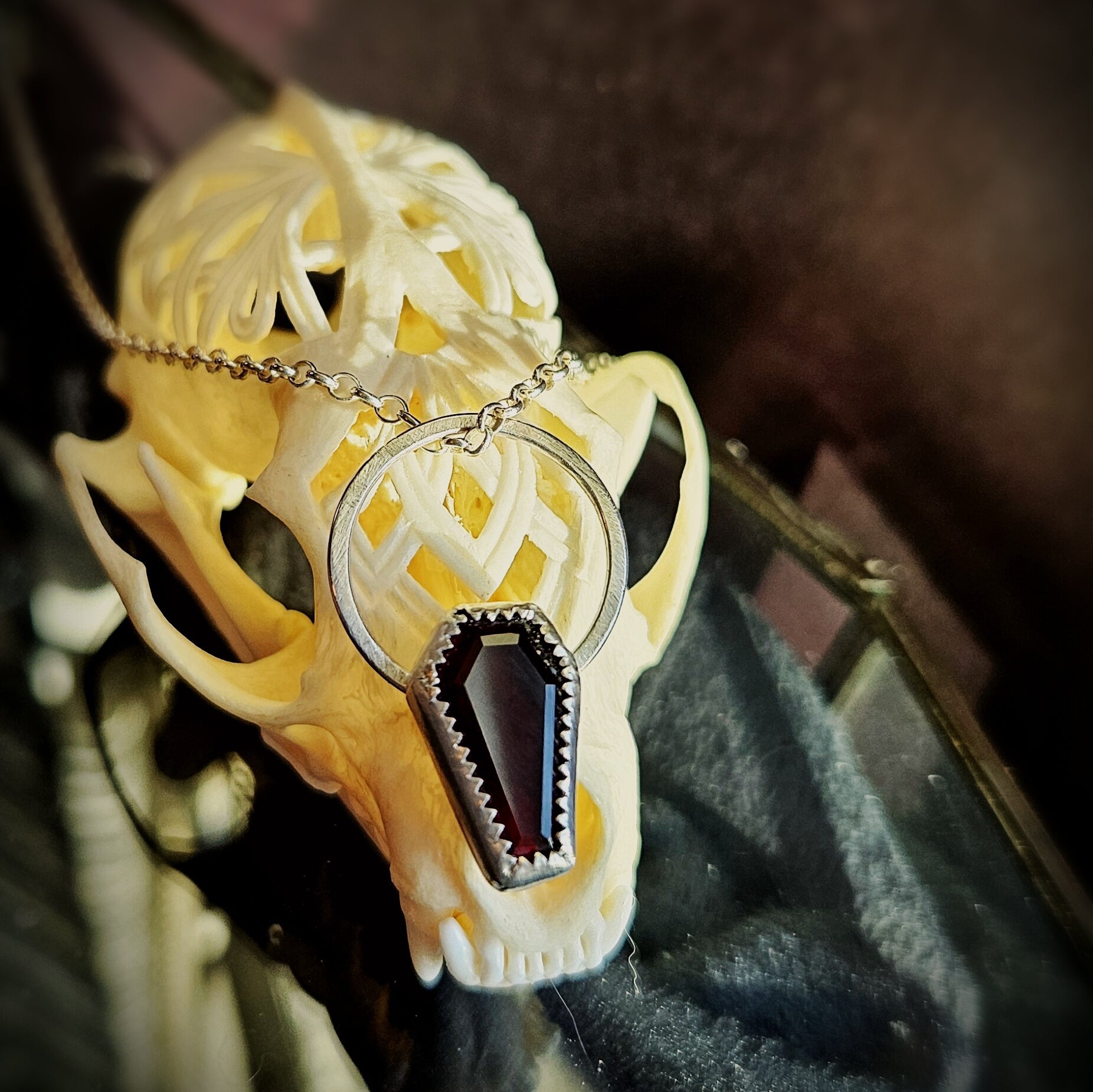This Garnet coffin stone is set in sterling silver hand made bezel and attached to a hand shaped halo.