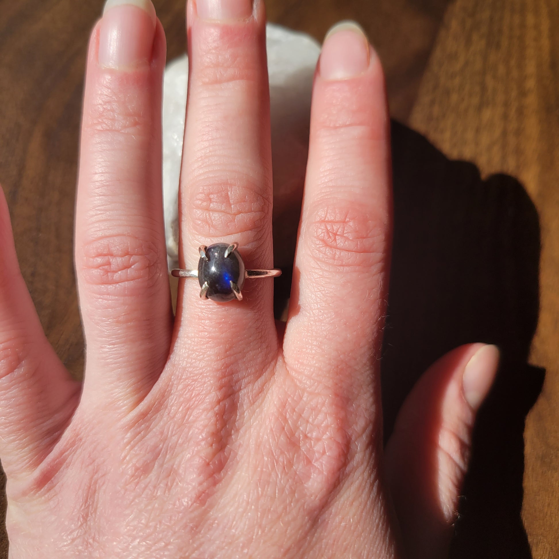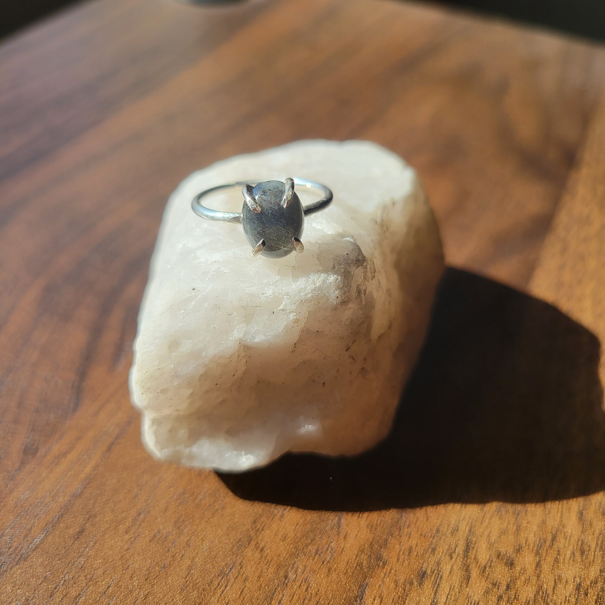 This was a found stone so the exact type is unknown, the coloring it blue/grey. The stone is set in sterling silver claw setting.