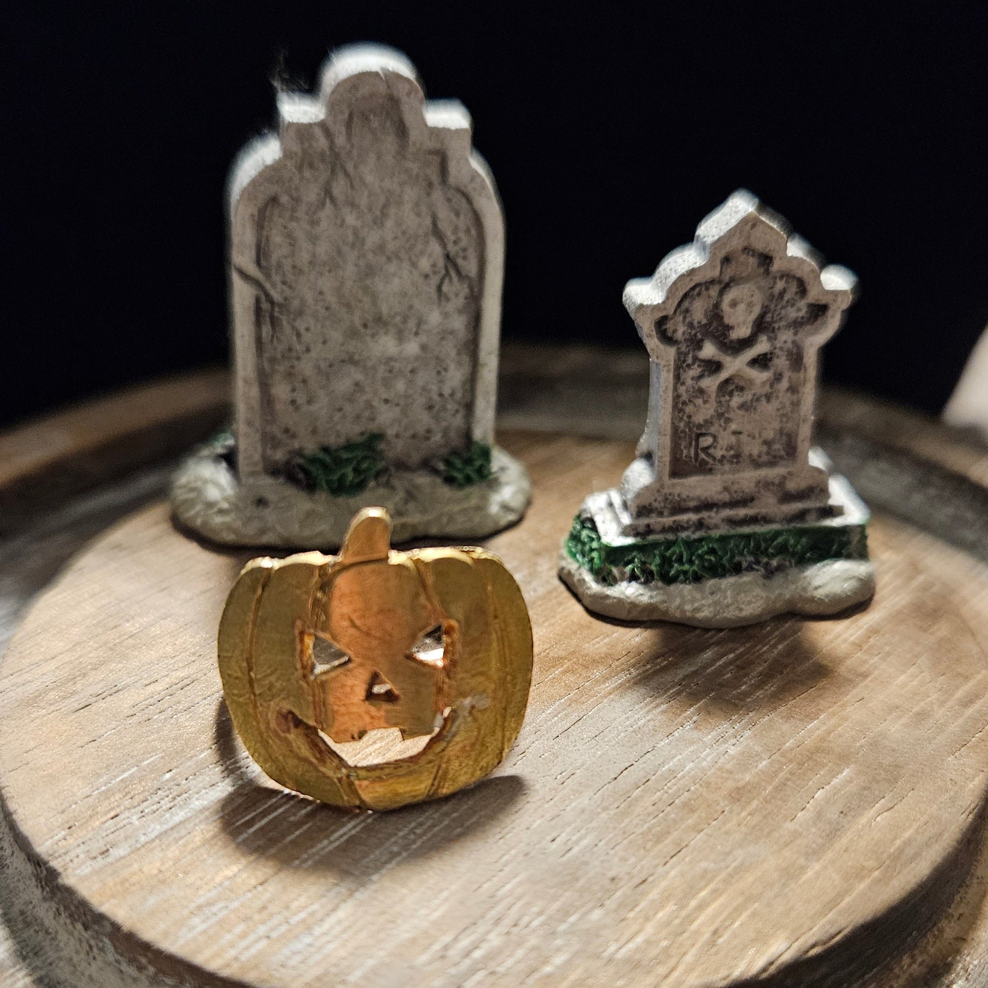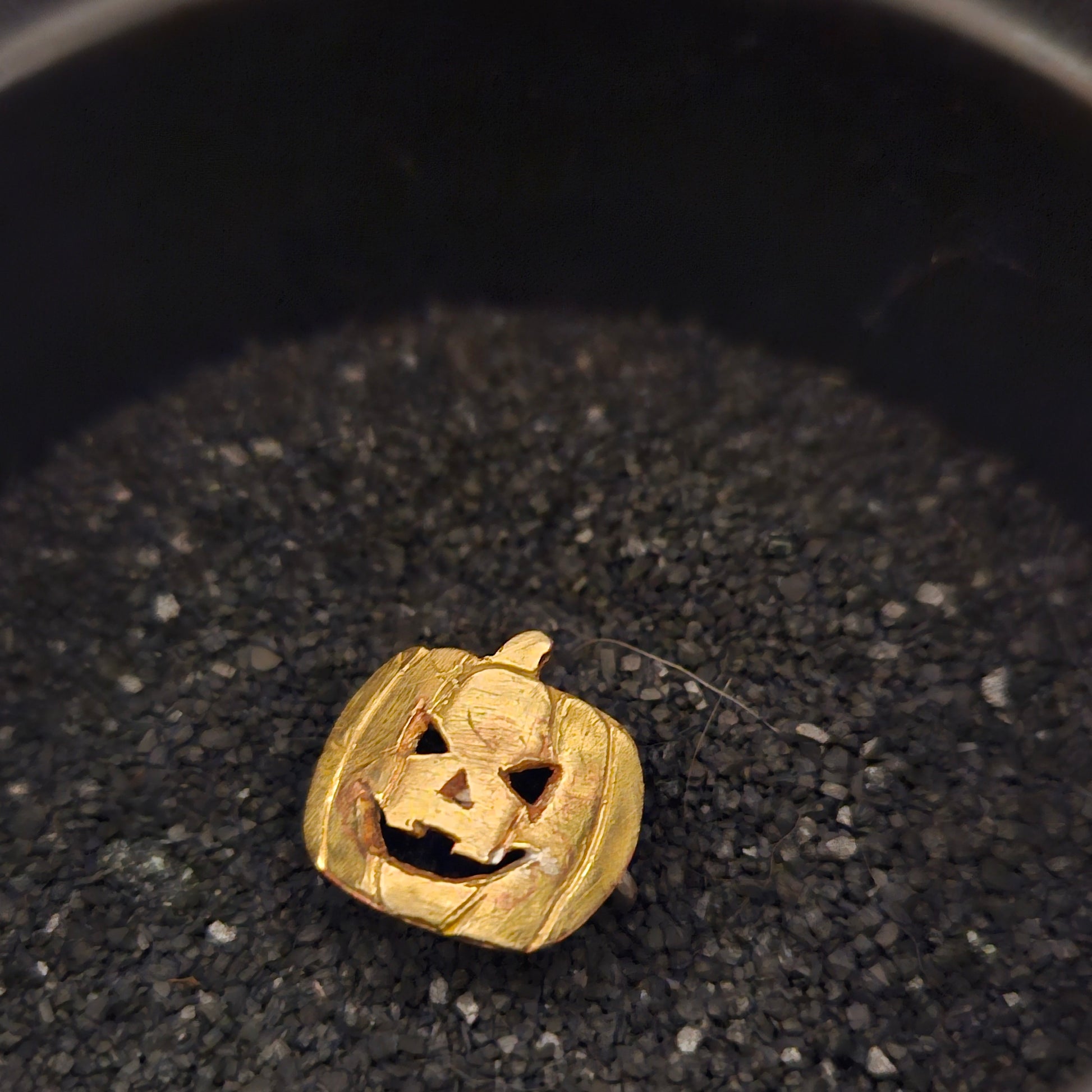 This brass jack-o-lantern design sits on a sterling silver band. Inspired by the Irish legand of Stingy Jack.