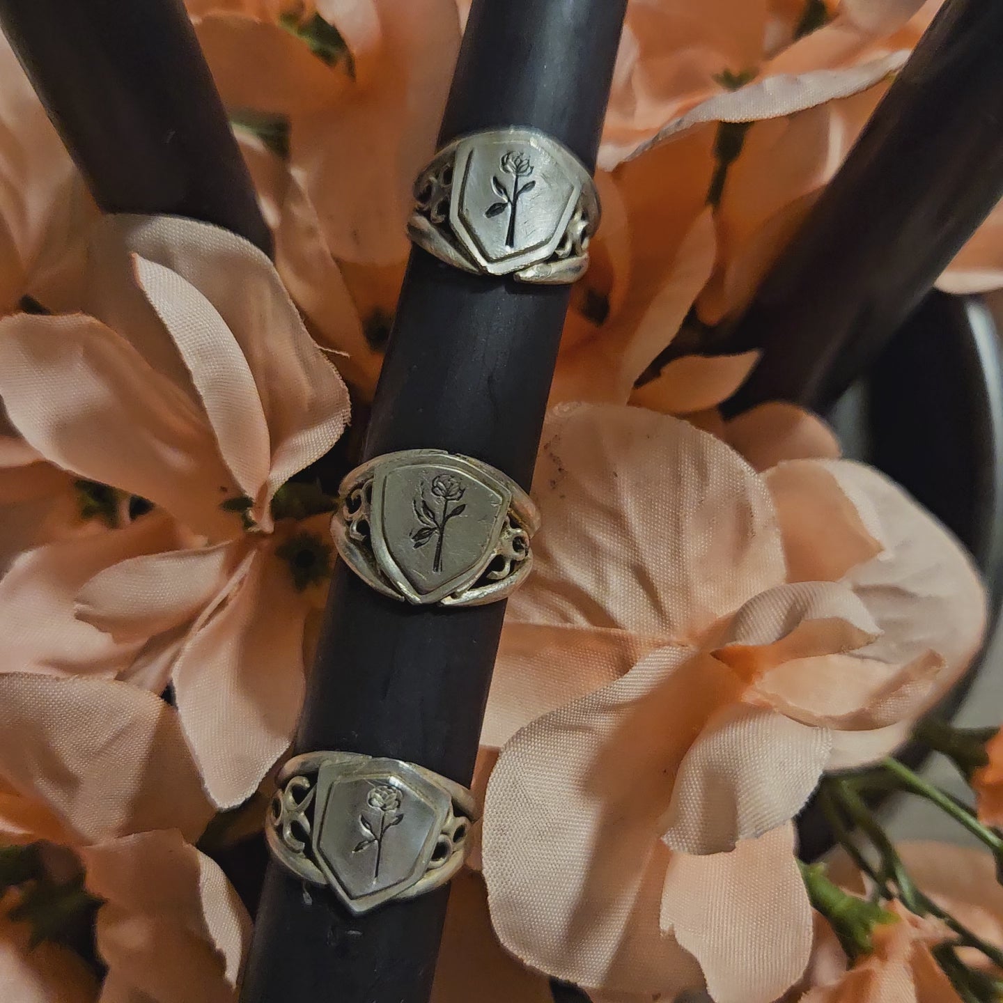 The Black Rosen Shield ring is here to protect you when you start a new challenge or journey. Made with sterling silver this handcrafted rose stamped shield and filagree comes in three sizes.